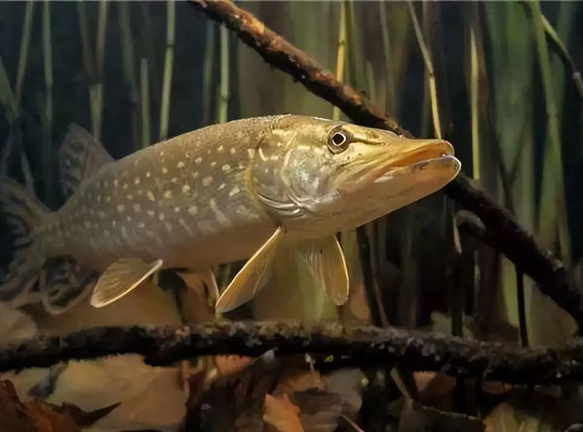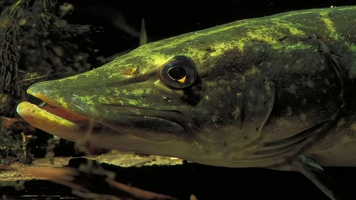 狗鱼——这种朔方淡水大型猛兽,体表布满迷彩斑纹,头顶的黄色眼睛长期在搜索猎物,属于天生的掠食者。