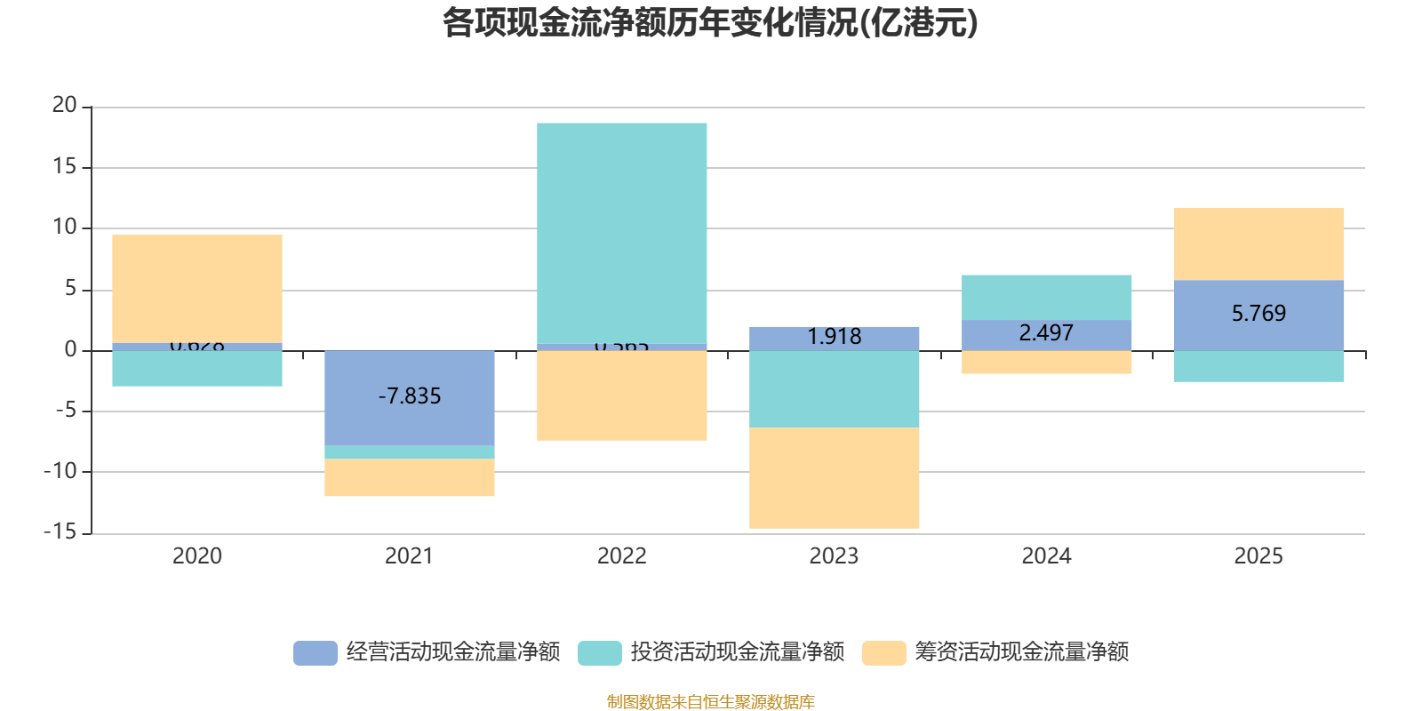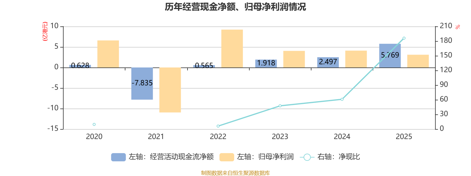 2025年,公司倡导活动现款流净额为5.77亿港元,同比增长131.04%;筹资活动现款流净额5.92亿港元,同比增多7.83亿港元;投资活动现款流净额-2.59亿港元,上年同时为3.68亿港元。