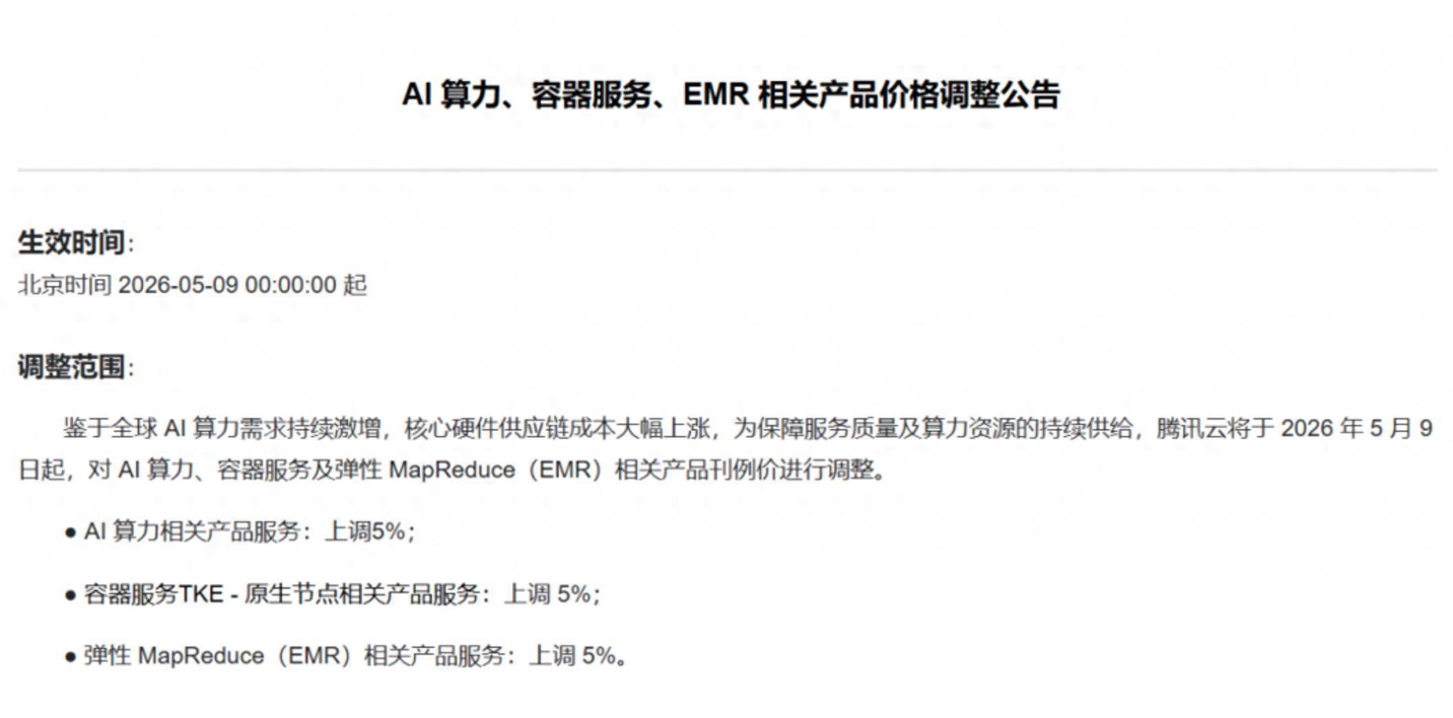 公告称,“鉴于环球AI算力需求合手续激增,中枢硬件供应链本钱为保险劳动质料及算力资源的合手续供给,腾讯云将于2026年5月9日起,对AI算力、容器劳动及弹性MapReduce(EMR)关系居品刊例价进行改换。”其中,AI算力、容器劳动TKE-原生节点和弹性 MapReduce(EMR)关系居品劳动刊例价王人上调5%。