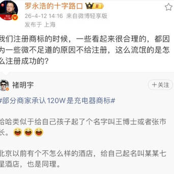 【罗永浩一句话,把充电器行业的底裤扒了】"120W不是充电功率,是商标。"罗永浩径直开炮吐槽,合理商标被各式卡,这种误导性的反而能注册,险些离谱。