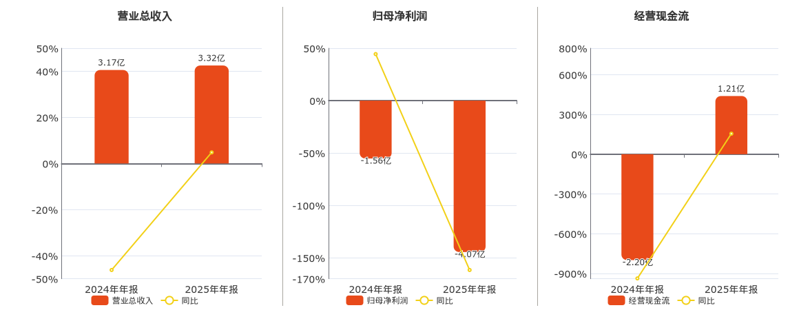 公司交易总收入为3.32亿元。归母净利润为-4.07亿元,较客岁同申报期归母净利润减少2.52亿元。策划活动现款净流入为1.21亿元。