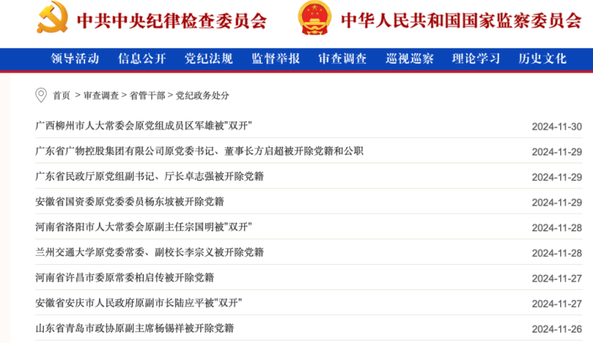 此外还有:中国证监会科技监管司原司长姚前被“双开”,重庆市国防动员办原一级巡查员崔维新被开除党籍,安徽省滁州市政协原党组布告、主席汪建中被“双开”,广东省地质局原党组布告、局长黄德发被“双开”,黑龙江省佳木斯市政协原党构成员、副主席付慧华被开除党籍,上海市宝山区委原副布告、宝山区原区长高奕奕被“双开”,等等。
