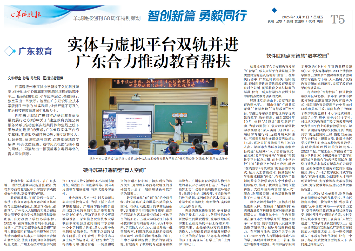 聪敏课堂走进山乡,提高当地进修教研水平。广州市依托“广州分享课堂”“聪敏阅读”“聪敏教研”等平台,与湛江等帮扶合作地分袂享优质进修教学、教研资源。截止2024年10月,依托“AI师训”课堂测评活动,为清远提供20节大数据课堂教学会诊工作;深切现实“AI师训”云表研学专递活动,汉典开展双师课堂、三师课堂和专递课堂等活动特出14场,惠及湛江等地师生约12439东说念主次。深圳市龙华区在河源市紫金县构建“互联网+”东说念主才培养新模式,在县城18所学校推动“学乐云”聪敏教学平台试点应用,在州里中小学进行“101”进修平台的试点应用,会通“在线教学+传统课堂”的搀和教学模式,哄骗东说念主工智能本领,协助教师对学生变成精确“画像”,灵验耕作了教师的数字化教学陶冶与个性化学习带领才气,推动了教师扮装的当代化转型。救援单元长期贯彻“融入式”理念,利用云资源,推动基础进修帮扶责任内涵式发展。
